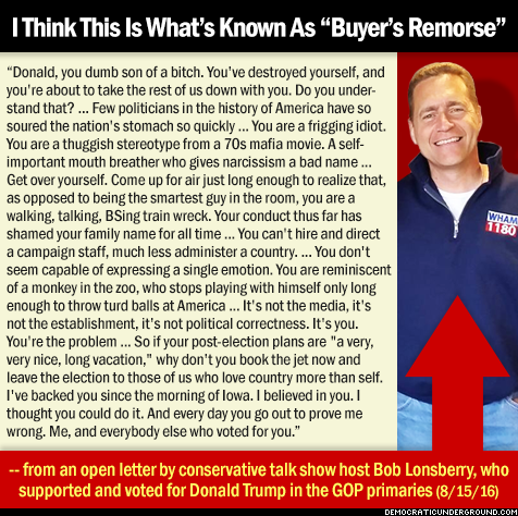 How many people voted for Trump through all the bullshit he was spewing before the convention and were so shocked at what has happened since that week?? How many are changing their minds?? Well to be honest back at convention time the polls were low 40 for both.. Likely the twenty percent that hadn't yet made up their minds are starting to.. Those who were Trump fans are still likely on board with Trump, the other 20% are starting to show their mind.. There are a few that are flip Flopping from their boy Donnie.. I started at zero percent chance of changing my mind when Trump announced last year, and had he said anything at all I agreed with it wasn't enough to change my mind.. I don't like republicans and it was reinforced after the past mid terms when they (GOP) announced they were going to double down on obstructing Obama, because they "aren't the party to govern but rather to obstruct" Yep... Well see what that gets you..